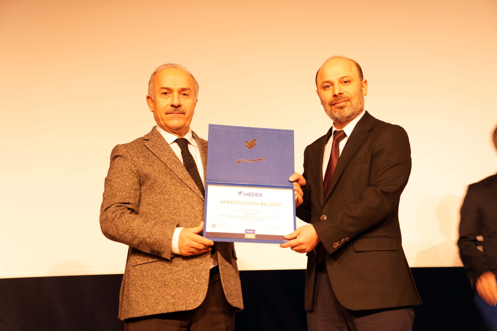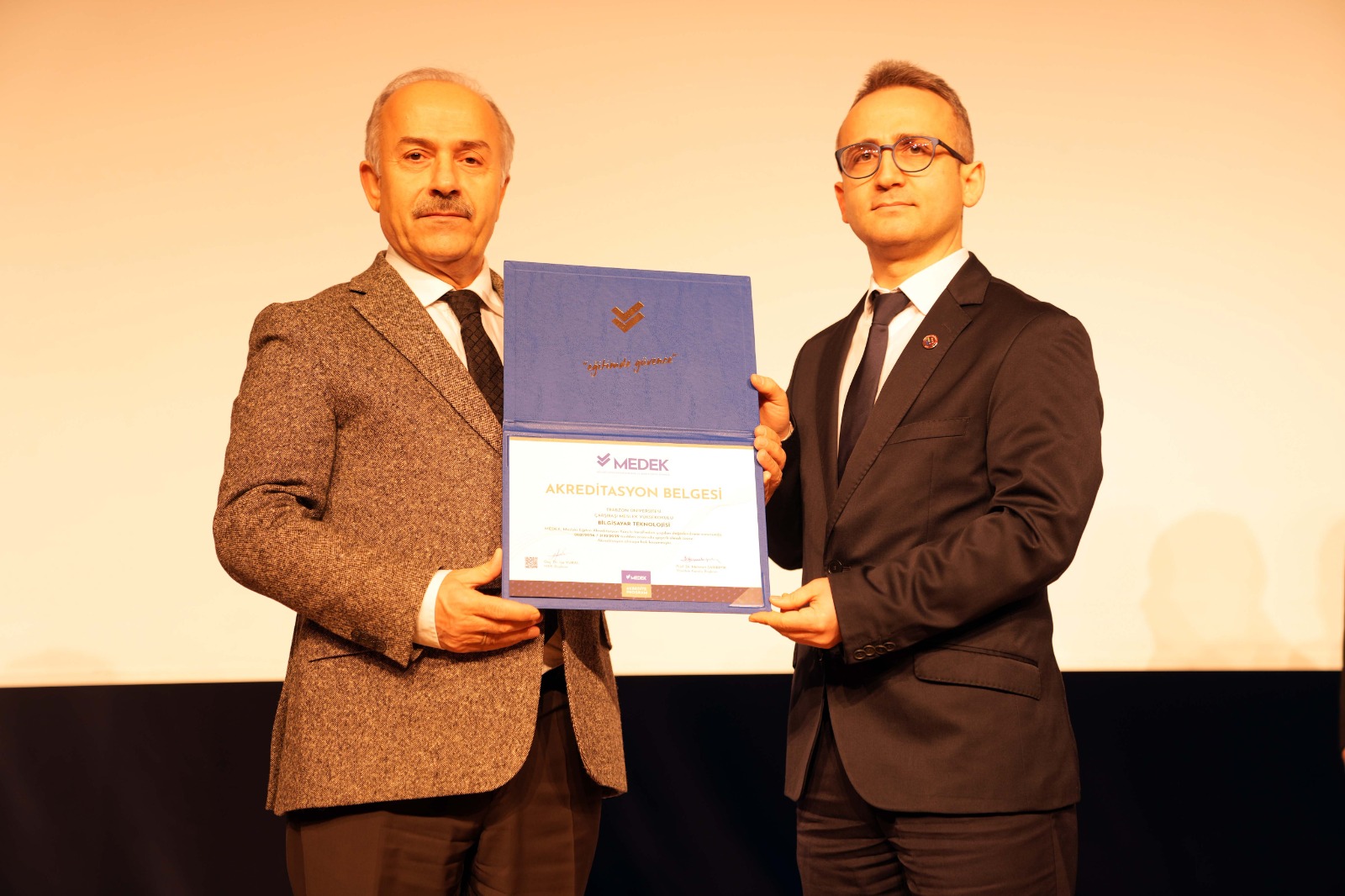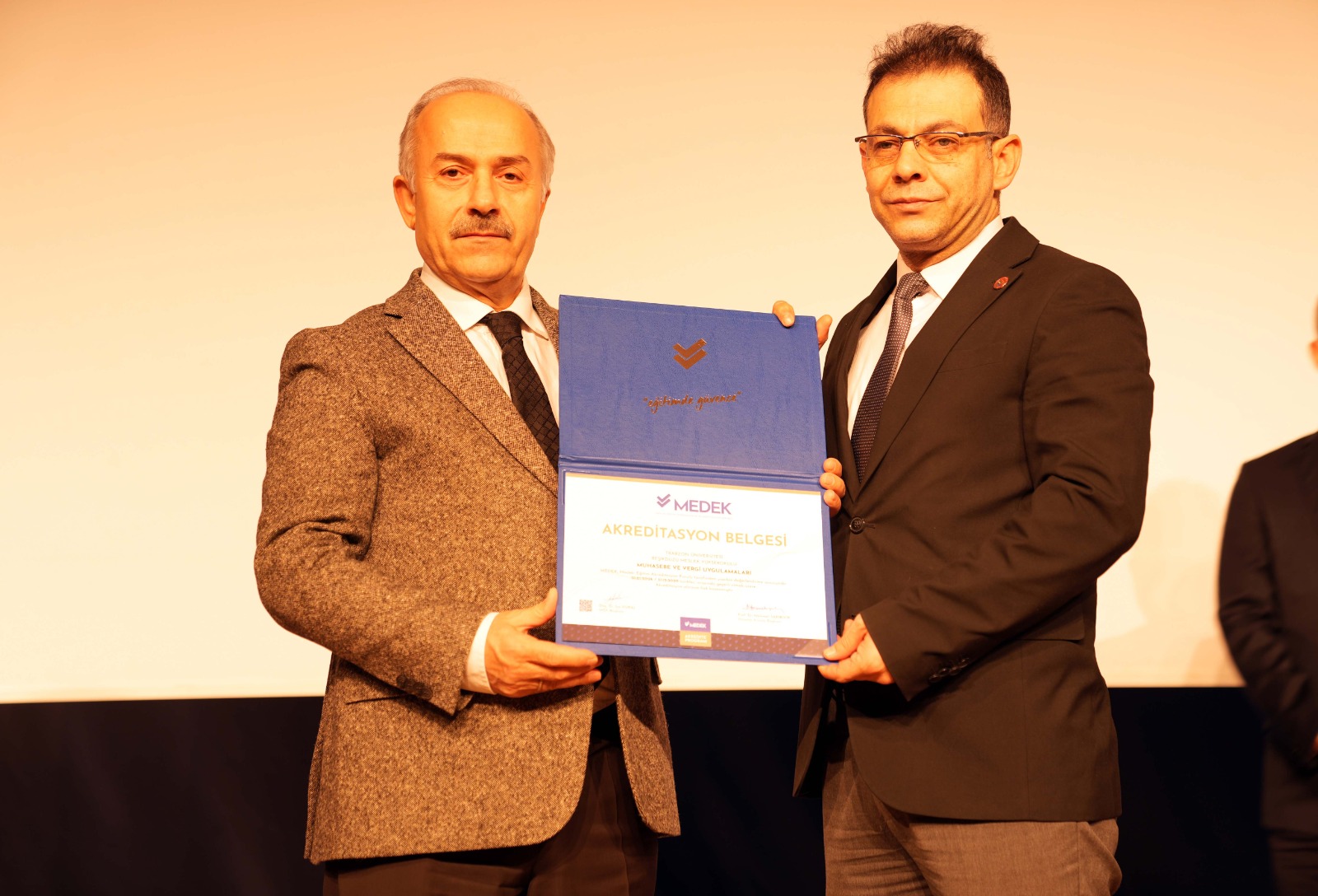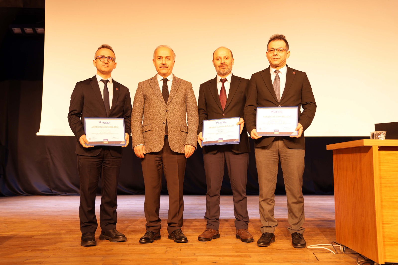 Ardından 2025 yılında programları akredite edilen üç meslek yüksekokulunun müdürlerine Rektörümüz Prof. Dr. Emin Âşıkkutlu tarafından MEDEK'in düzenlediği Akreditasyon Belgeleri takdim edildi. Beşikdüzü Meslek Yüksekokulu Müdürümüz Dr. Öğr. Üyesi Ertuğrul Karoğlu, Çarşıbaşı Meslek Yüksekokulu Müdürümüz Dr. Öğr. Üyesi Lokman Şılbır ve Tonya Meslek Yüksekokulu Müdürümüz Dr. Öğr. Üyesi Galip Usta da Rektörümüze teşekkür ettiler.