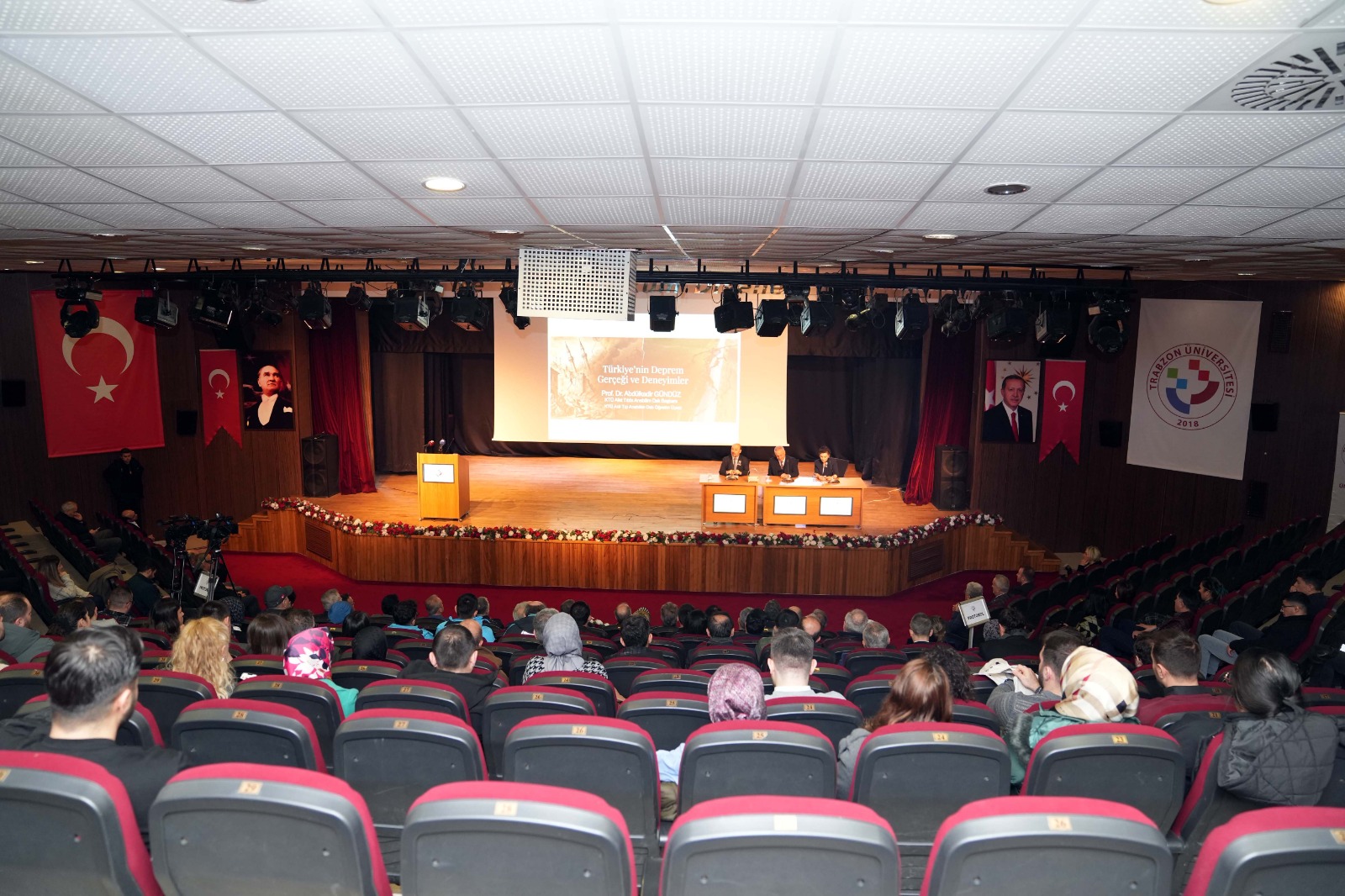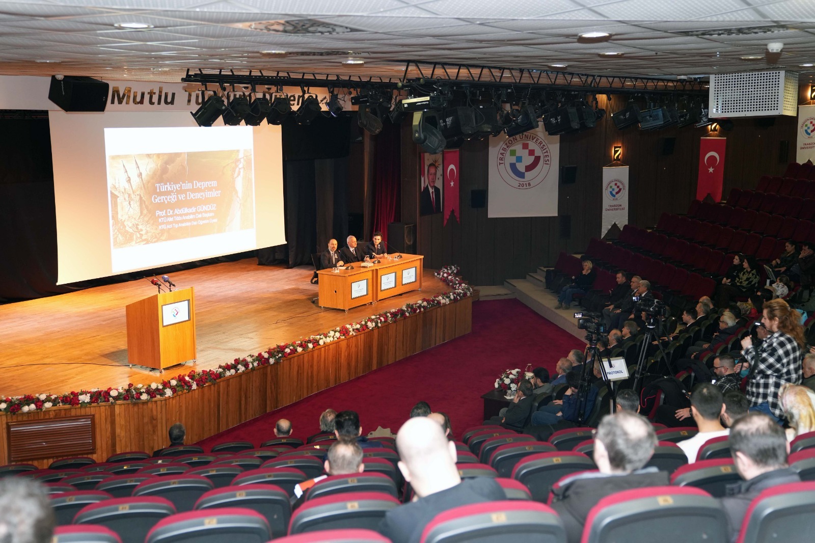 Saygı Duruşu ve İstiklâl Marşı ile başlayan programda, aralarında Üniversitemiz öğrencilerinin de bulunduğu deprem şehitlerinin ruhlarına ithafen İlahiyat Fakültemiz Öğr. Gör. Dr. Lachin Guliyev tarafından Kur’an-ı Kerim okundu ve dua edildi. Ardından, afetin büyüklüğünü ve sebep olduğu yıkımı gösteren bir video gösterimi gerçekleştirildi. Rektör Prof. Dr. Emin Âşıkkutlu yönetiminde, Tonya Meslek Yüksekokulumuz (Acil Yardım ve Afet Yönetimi ekibi) saha önderliğinde deprem bölgesinde aktif görev alarak depremzede vatandaşlarımızı enkaz altından kurtaran kurumlardan biri olan TRÜ, asrın felaketine bu yıl da duyarsız kalmadı. "6 Şubat Depremleri: Sahadan Bilime – Travmadan Dayanıklılığa" adlı panel programında, ülkenin ve bölgenin deprem gerçeği tüm yönleriyle ele alınırken, yaklaşık 54 bin insanımızı yitirdiğimiz yıkıcı afetin yıldönümünde hem deprem şehitleri rahmet ve hürmetle anıldı; hem de tezahür eden travmalardan çıkarılması gereken bilimsel ve toplumsal dersler uzmanlar tarafından ele alındı.