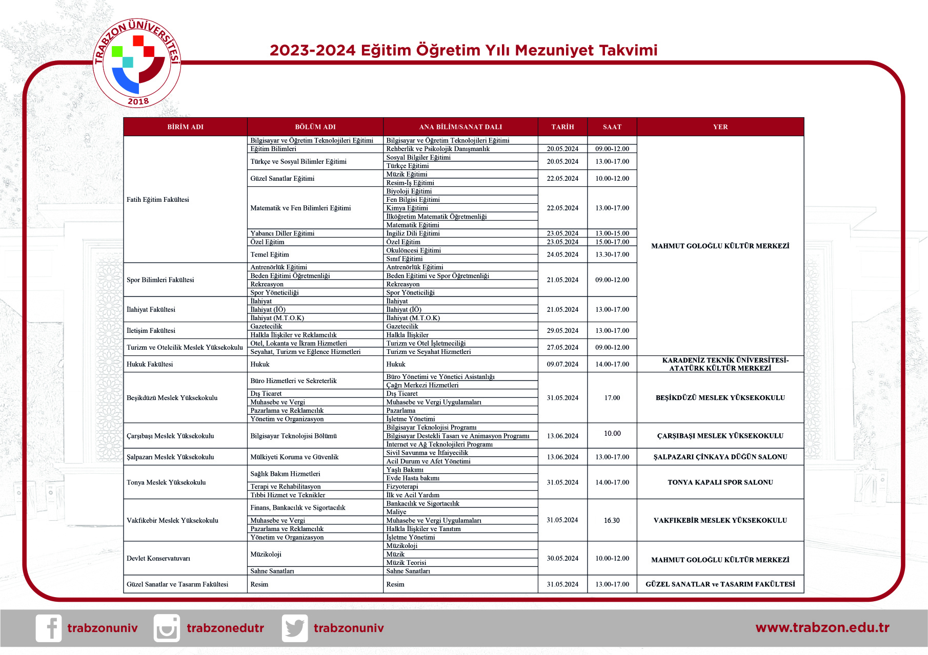 2023-2024 Eğitim-Öğretim yılı Mezuniyet törenlerine ilişkin bilgiler ve program aşağıda bulunan takvim üzerinde gösterilmiştir.