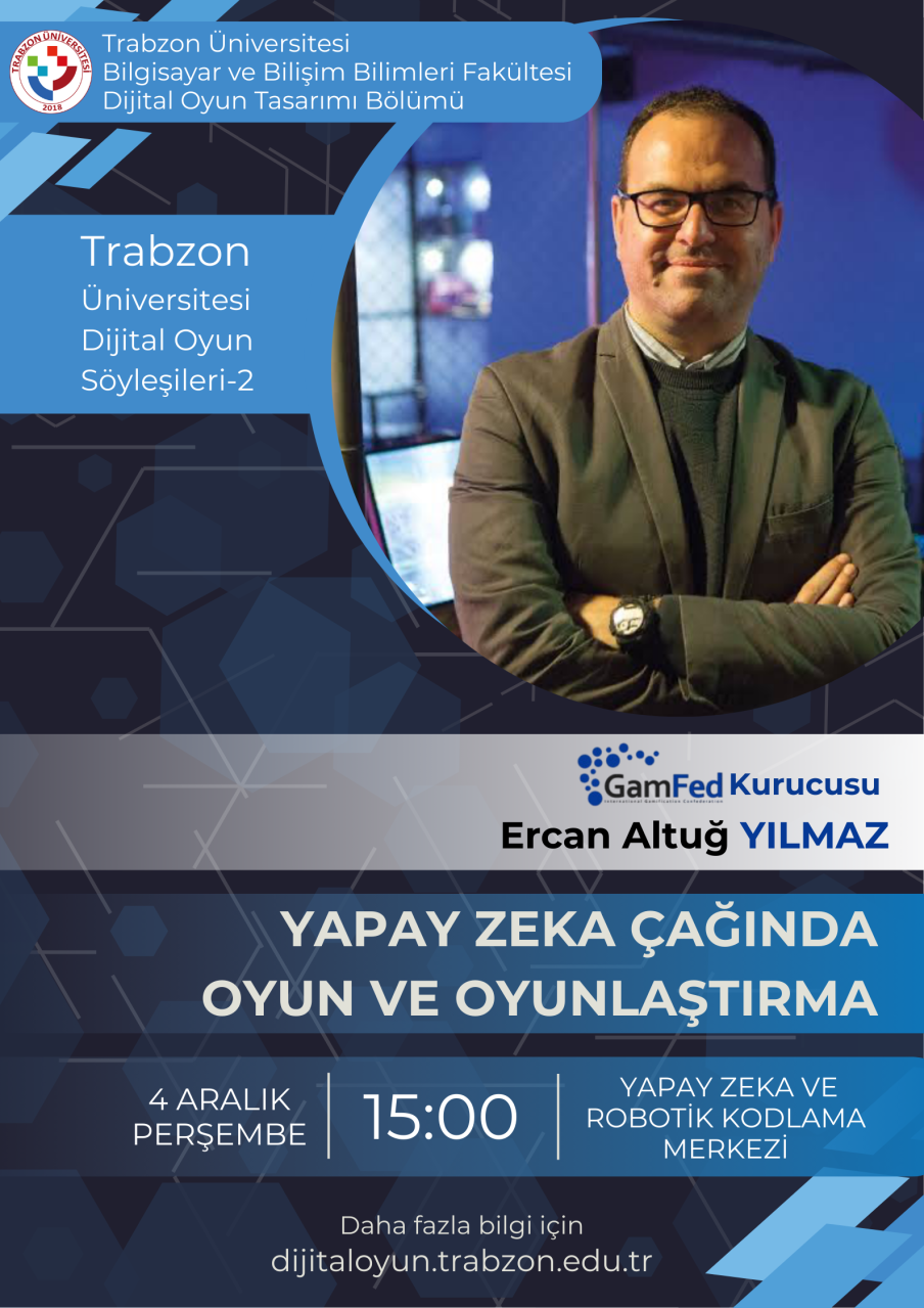 Trabzon Üniversitesi Bilgisayar ve Bilişim Bilimleri Fakültesi Dijital Oyun Tasarımı Bölümü olarak, yapay zeka teknolojilerinin dijital oyun dünyasına etkileri söyleşisi gerçekleştirilecektir.