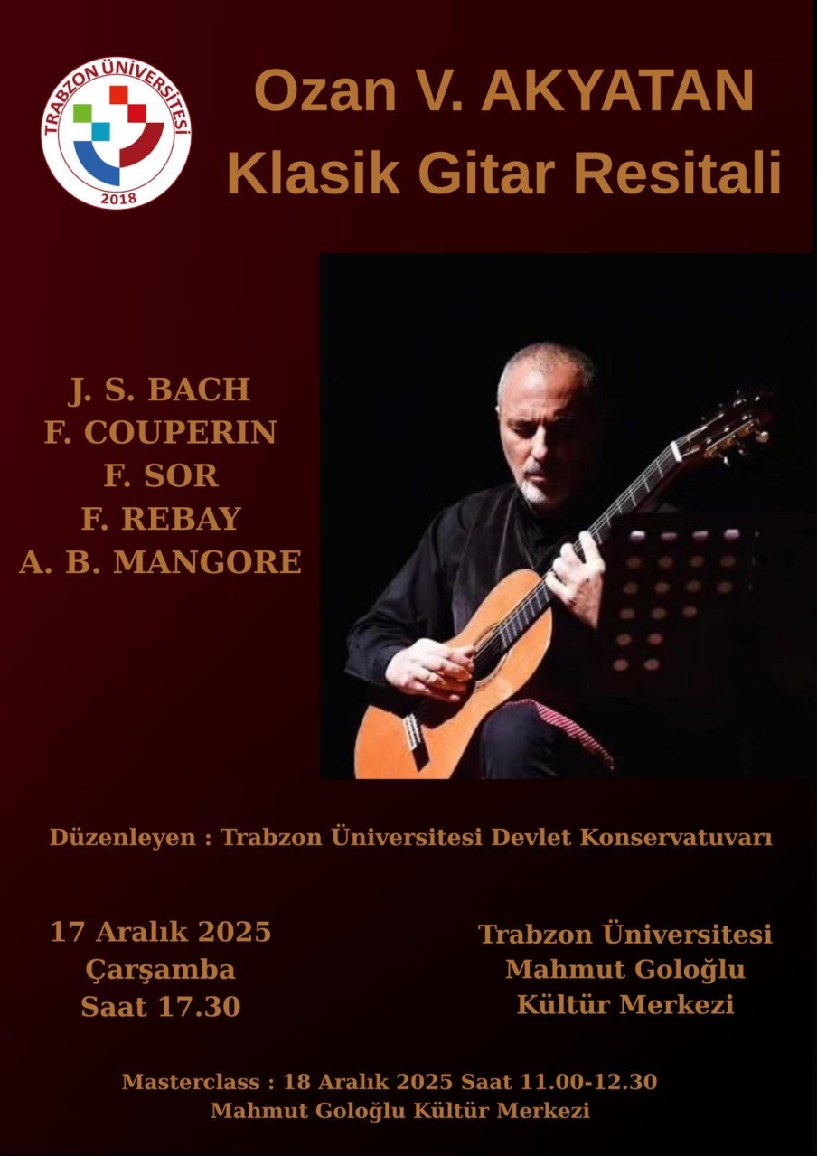 Trabzon Üniversitesi Devlet Konservatuvarı olarak, değerli gitar sanatçısı Ozan V. Akyatan’ı üniversitemizde ağırlamaktan büyük mutluluk duyuyoruz. Usta icracı, Barok dönemden 20. yüzyıla uzanan zengin bir repertuvarla dinleyicilerle buluşacak.
