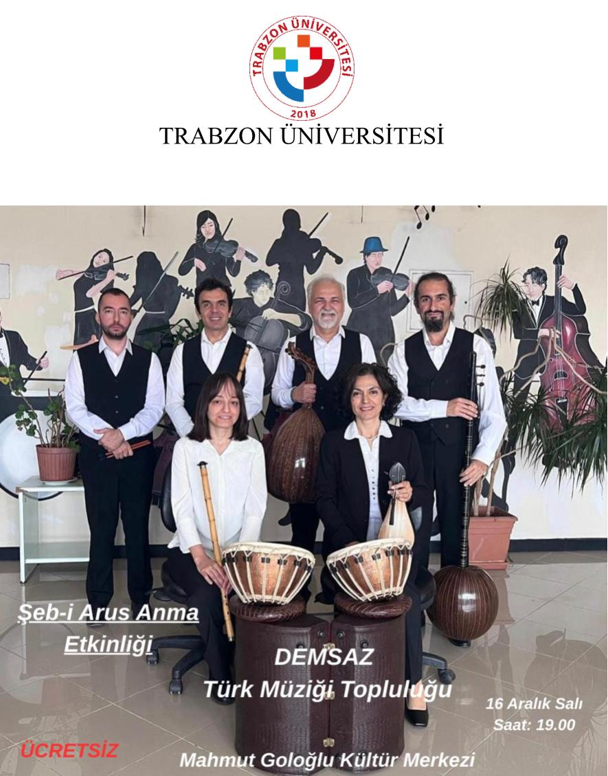 Trabzon Üniversitesi tarafından düzenlenen Şeb-i Arûs Anma Etkinliği kapsamında, Mevlânâ Celâleddîn-i Rûmî’nin 752. ölüm yıldönümü; sevgi, hoşgörü ve birlik anlayışını yansıtan özel bir müzik programı ile anılacaktır. Etkinlik, DEMSAZ Türk Müziği Topluluğu tarafından icra edilecek olup, geleneksel Türk müziğinin seçkin eserleri dinleyicilerle buluşturulacaktır.