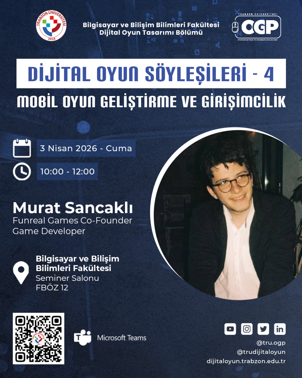 Trabzon Üniversitesi Bilgisayar ve Bilişim Bilimleri Fakültesi, Dijital Oyun Tasarımı Bölümü tarafından yürütülen Dijital Oyun Söyleşileri etkinlik dizisinin dördüncüsü, bu kez Oyun Geliştirme ve Programlama Kulübü organizasyonuyla gerçekleştirilecektir.