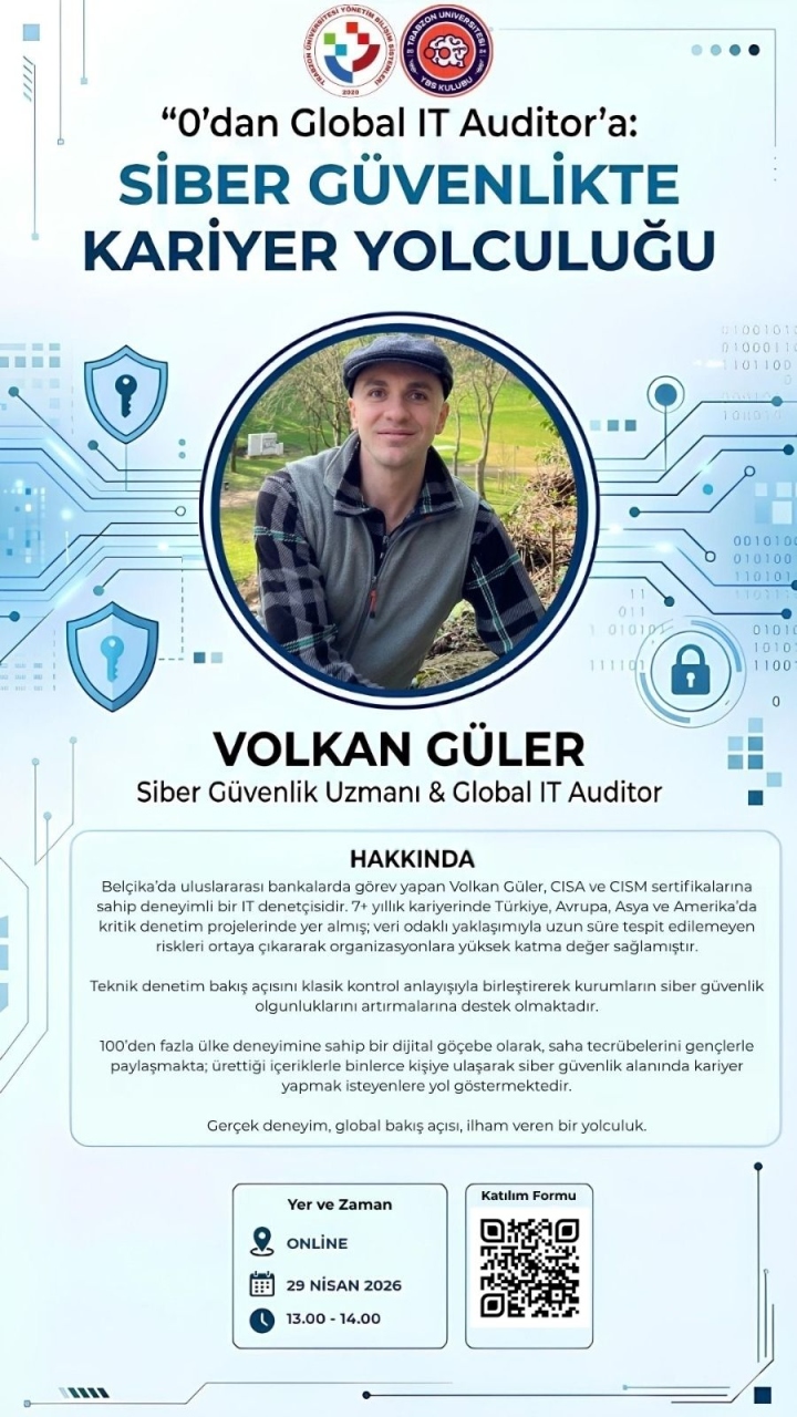 Yönetim Bilişim Sistemleri Bölümü ve YBS Kulübü iş birliğiyle düzenlenen etkinlikte, uluslararası deneyime sahip IT Auditor ve Siber Güvenlik Uzmanı Volkan Güler öğrencilerle buluşacaktır.