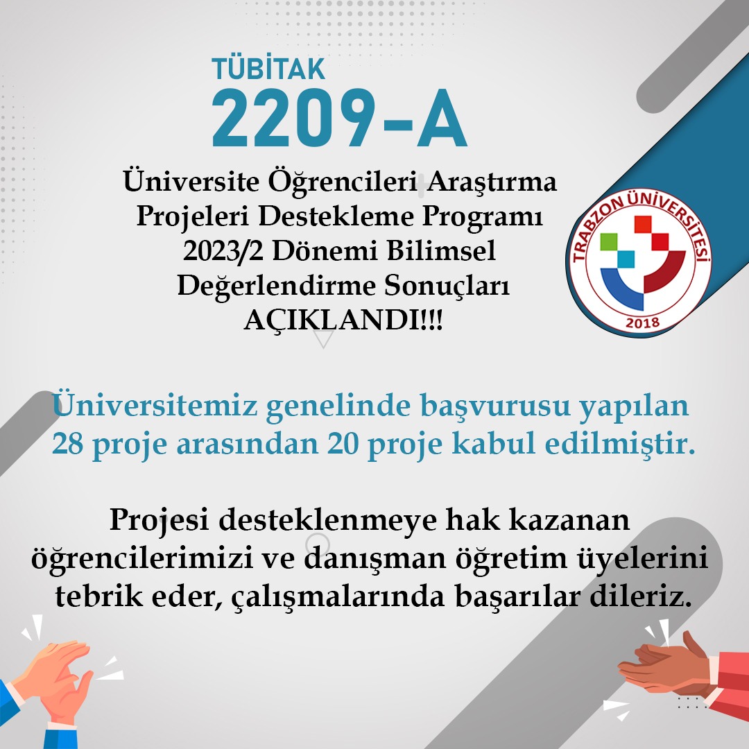 TÜBİTAK 2209/A Üniversite Öğrencileri Araştırma Projeleri Destekleme Programı 2023/2 döneminde üniversitemiz genelinde 28 proje önerisi ile başvuruda bulunulmuştur. İlgili akademisyenlerimizin danışmanlığında öğrencilerimizin önermiş olduğu 20 proje desteklenmeye hak kazanmıştır. Akademisyenlerimizi ve öğrencilerimizi tebrik eder, çalışmalarında başarılar dileriz.