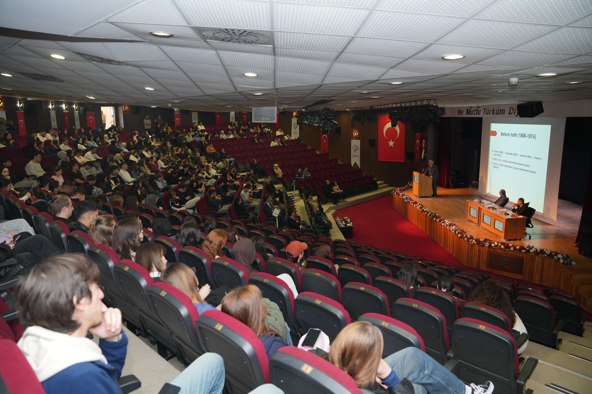 Gençlerden yoğun ilgi gören panel programına Rektörümüz Prof. Dr. Emin Âşıkkutlu, Rektör Yardımcımız Prof. Dr. Atilla Çimer, Genel Sekreterimiz Doç. Dr. Ufuk Töman, dekanlarımız, müdürlerimiz, daire başkanlarımız, akademik ve idari personelimiz ile öğrencilerimiz katıldı.