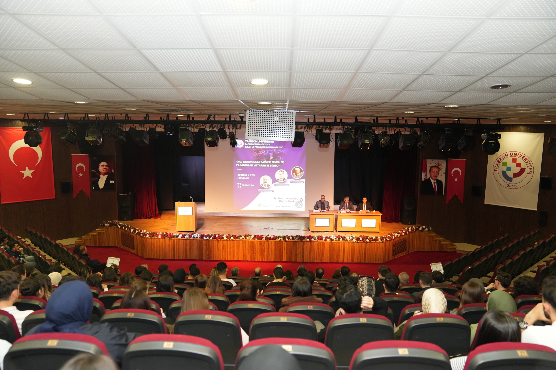 Fatih Yerleşkemiz içerisindeki Mahmut Goloğlu Kültür Merkezinde gerçekleştirilen panelde moderatörlüğü Fatih Eğitim Fakültesi Türkçe ve Sosyal Bilimler Eğitimi Bölümünden Prof. Dr. Mehmet Akpınar üstlendi. Panelistlerden Karadeniz Teknik Üniversitesi (KTÜ) Edebiyat Fakültesi Tarih Bölümü Yakınçağ Tarihi Anabilim Dalı öğretim üyesi Doç. Dr. Ahmet Köksal “Osmanlı Devleti’nde Egemenlik Tasavvurları ve Cumhuriyet’in Fikri Arka Planı”; Üniversitemiz İnsan ve Toplum Bilimleri Fakültesi Tarih Bölümü öğretim üyesi Dr. Öğr. Üyesi Nurettin Çakıcı ise “Osmanlı’dan Cumhuriyete Türkiye’de Anayasal Süreçler ve Cumhuriyetin Kazanımları” konusunda sunum gerçekleştirdi.