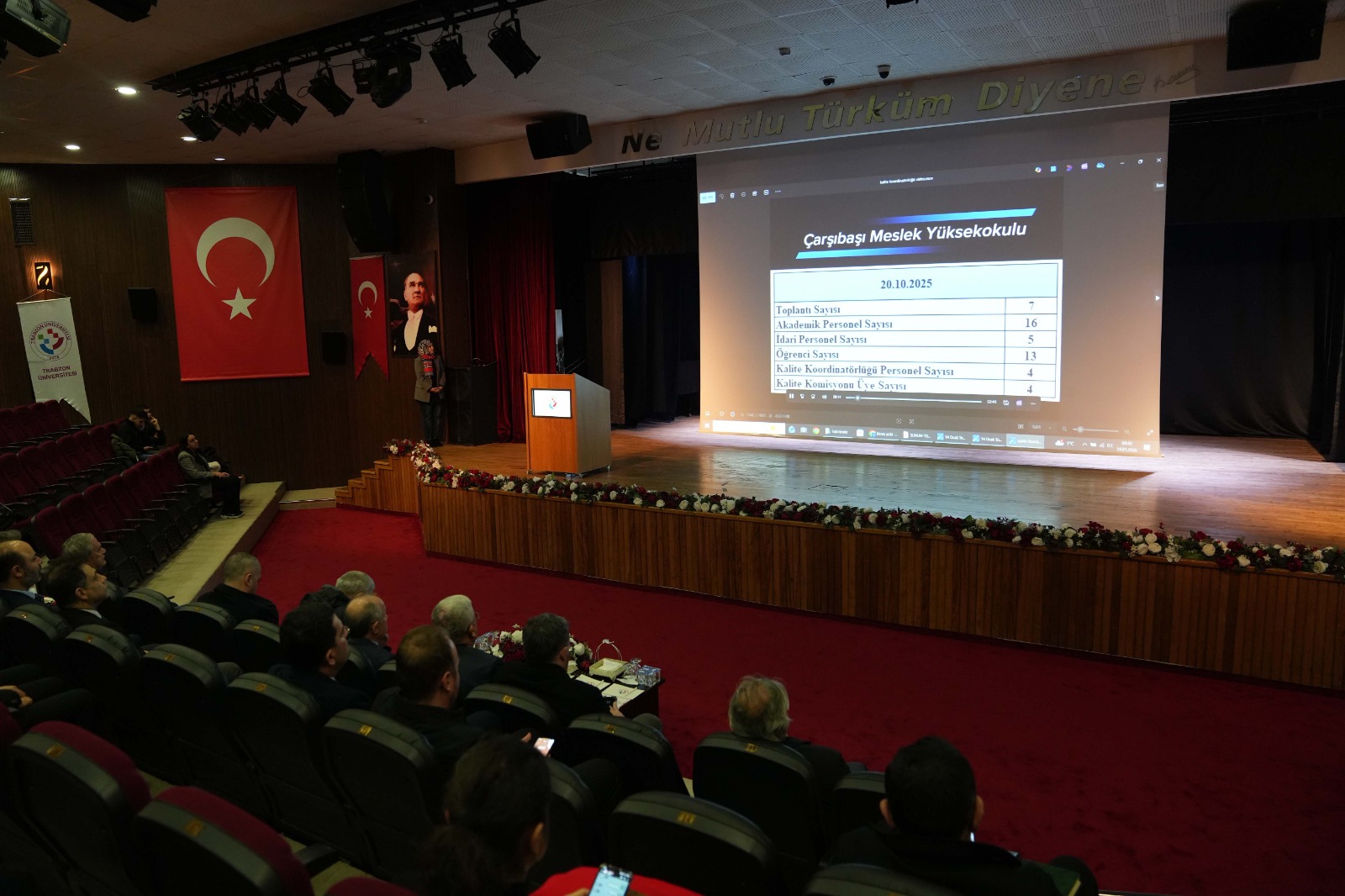 Devlet Konservatuvarı, Uygulamalı Bilimler Yüksekokulu, Yabancı Diller Yüksekokulu ve Meslek Yüksekokulları (Beşikdüzü Meslek Yüksekokulu, Çarşıbaşı Meslek Yüksekokulu, Şalpazarı Meslek Yüksekokulu, Tonya Meslek Yüksekokulu, Turizm ve Otelcilik Meslek Yüksekokulu, Vakfıkebir Meslek Yüksekokulu) müdürleri, birimlerinin 2024 ve 2025 yılları karşılaştırmalı performans verilerini ve akreditasyon süreçlerine ilişkin hazır bulunuşluk düzeylerini içeren 15 dakikalık sunumlarını gerçekleştirdiler. Sunumlar, Üniversitede kalite kültürünün yaygınlaştırılması ve sürdürülebilir iyileştirme anlayışının güçlendirilmesi hedefiyle ele alındı. Gün boyu devam eden oturumlara Rektörümüz Prof. Dr. Emin Âşıkkutlu başkanlık yaptı. Rektör Yardımcılarımız Prof. Dr. Atilla Çimer, Prof. Dr. Hasan Karal, Prof. Dr. Hüseyin Serencam, Genel Sekreterimiz Prof. Dr. Ufuk Töman, Fakülte Dekanları, Enstitü, Yüksekokul, Meslek Yüksekokulu ve Konservatuvar Müdürleri, Kalite Komisyonu üyeleri ile Kalite Koordinatörlüğü ekibi de toplantılarda hazır bulundu.