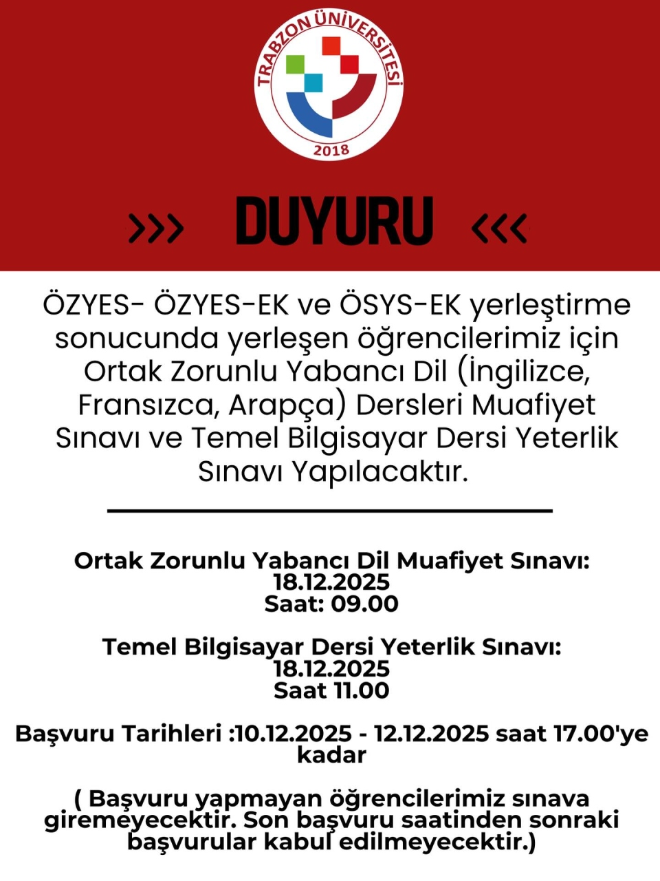 Ortak Zorunlu Yabancı Dil Ve Temel Bilgisayar Dersi Muafiyet Sınavı Başvuruları Hakkında Duyuru için tıklayınız.