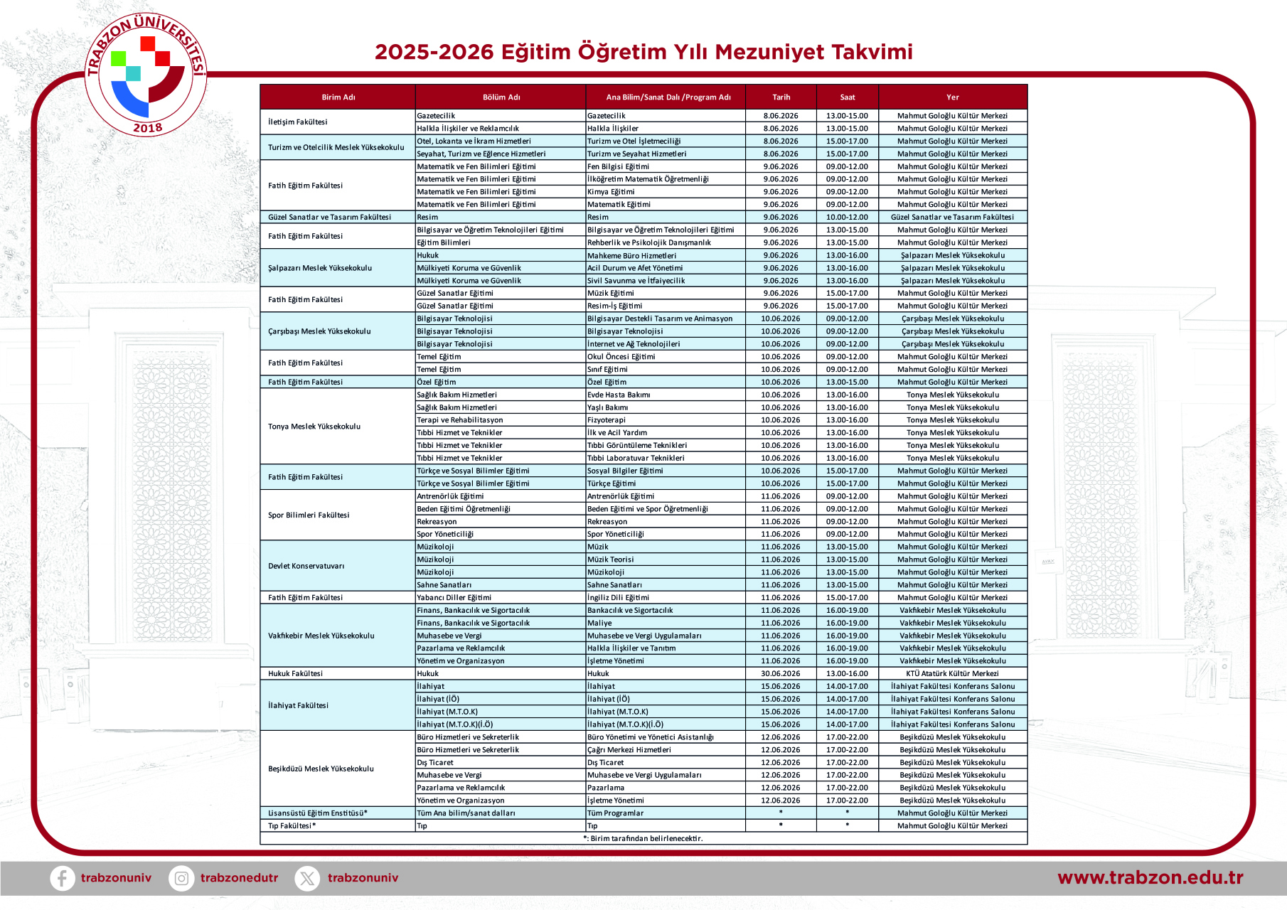 2025-2026 Eğitim-Öğretim yılı Mezuniyet törenlerine ilişkin bilgiler ve program aşağıda sunulmuştur.