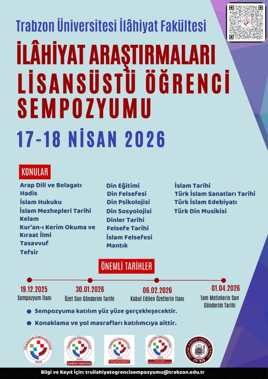 Trabzon Üniversitesi (TRÜ) İlahiyat Fakültesi ev sahipliğinde; TRÜ İslami İlimler Uygulama ve Araştırma Merkezi, Kur’ân-ı Kerîm Araştırmaları ve Kıraat İlmi Enstitüsü ile Trabzon İlahiyat Fakültesi Derneği (TİF-DER) iş birliğiyle “İlahiyat Araştırmaları Lisansüstü Öğrenci Sempozyumu” 17–18 Nisan 2026 tarihlerinde gerçekleştirilecektir.