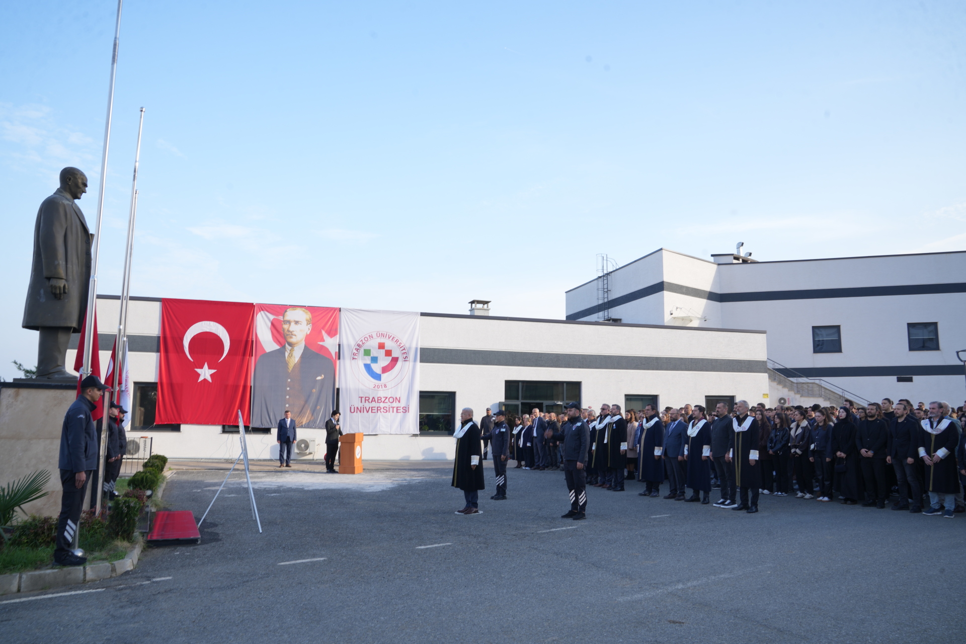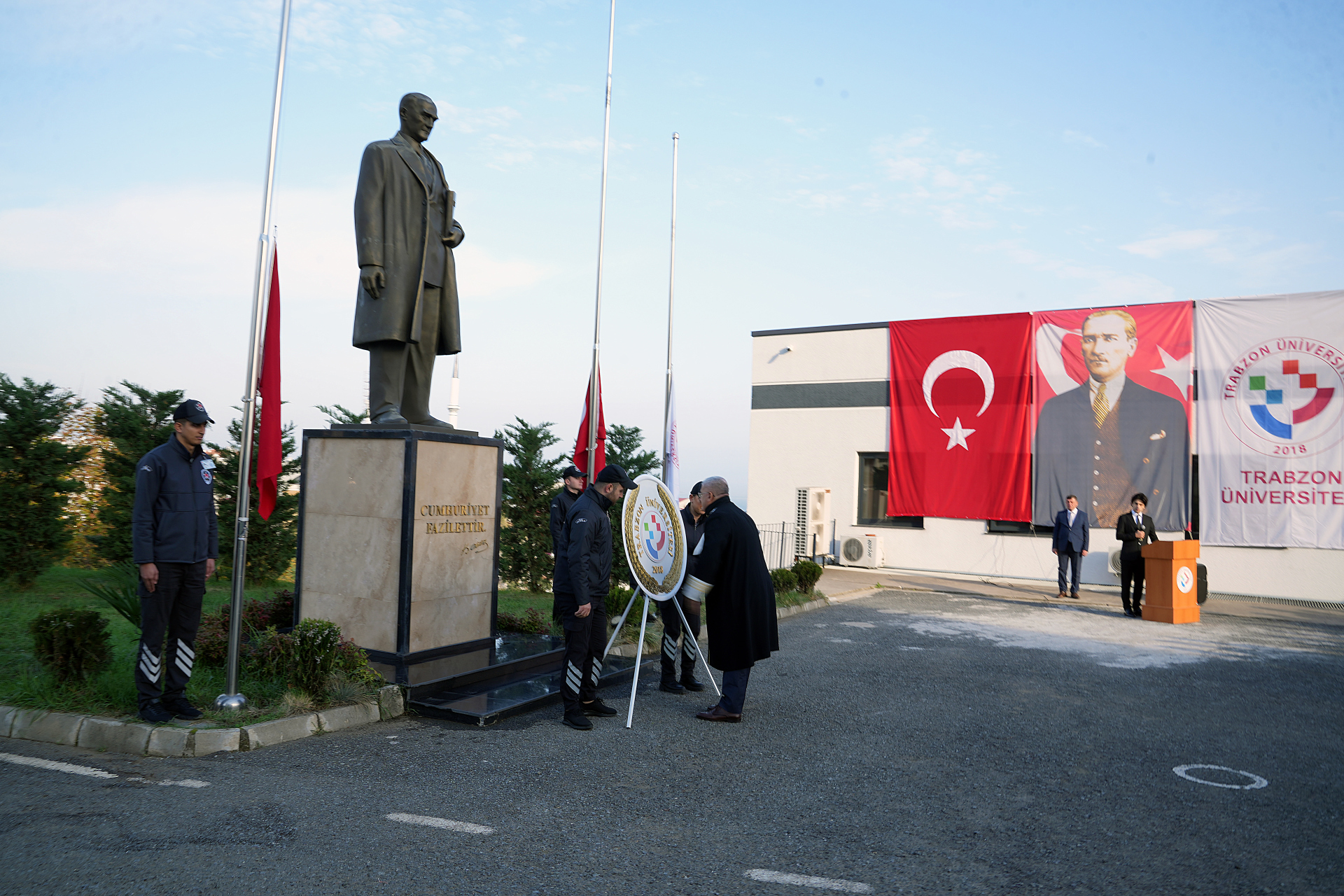 Fatih Kampüsümüz içerisinde yer alan Atatürk Anıtı önünde gerçekleştirilen törene, Rektör Yardımcılarımız Prof. Dr. Atilla Çimer, Prof. Dr. Hüseyin Serencam, dekanlarımız, müdürlerimiz, akademik ve idari personelimiz ile öğrencilerimiz katıldı.