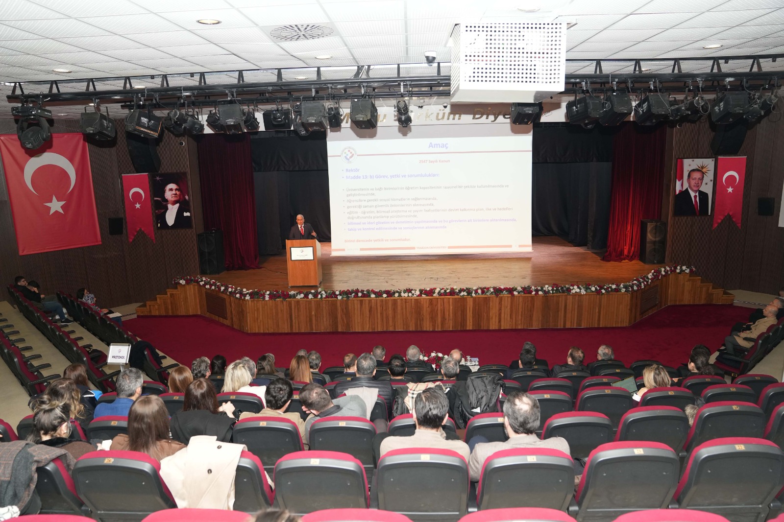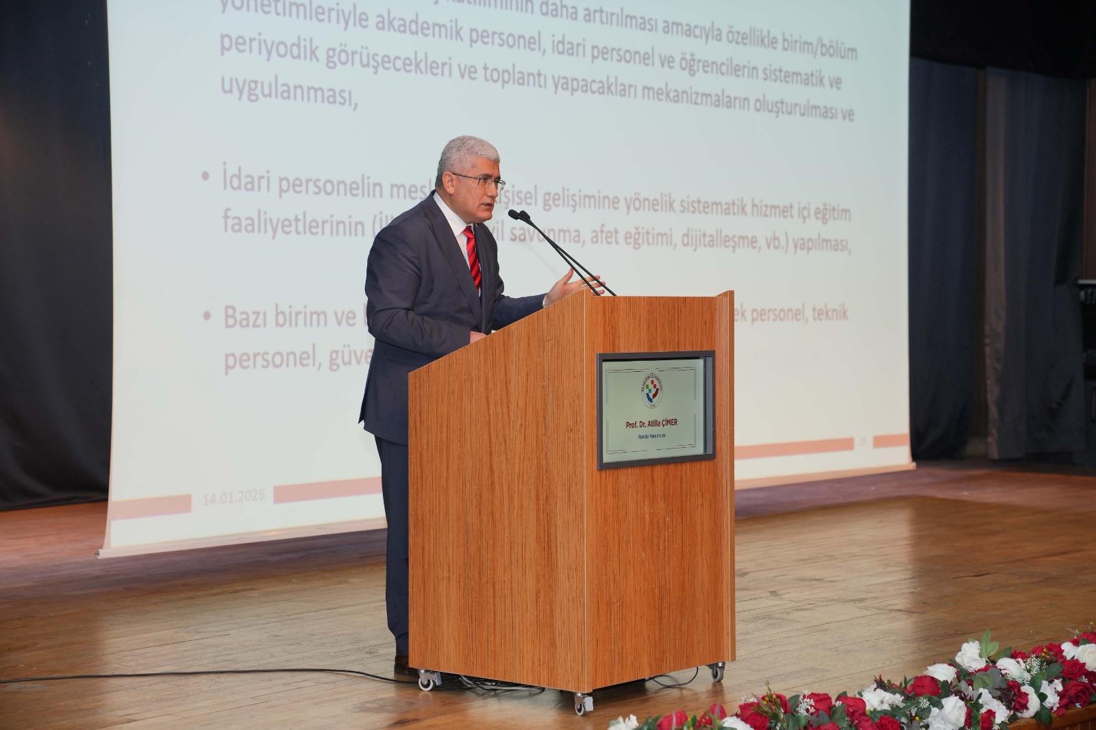 Sabah oturumunda söz alan Üniversitemiz Kalite Güvencesi Sistemi Süreçlerinden sorumlu Rektör Yardımcısı Prof. Dr. Atilla Çimer, Üniversitemiz Kalite Koordinatörlüğü ve Kalite Komisyonu’nun 2024 yılında başlattığı ve 2025 yılında da devam birim ziyaretleri hakkında özet bilgiler verdi. Çimer, 2025 yılında hemen hemen bütün birimleri kalite komisyonu üyeleriyle birlikte ziyaret ettiklerini belirttiği açılış konuşmasında, “Üç programımıza 4 yıllık akreditasyon alarak 2026 yılına başlamanın heyecanını yaşıyoruz. Lisans programlarımıza da aynı başarıları tekrarlayacağımıza inanıyoruz” dedi. Bu kapsamda, 7 akran değerlendirme ziyareti (4 meslek yüksekokulu ve 3 fakülte) ve 11 kalite süreçleri değerlendirme ziyaretinin gerçekleştirildiğini ve ziyaretlerde 100 saatten fazla toplantının yapıldığını söyledi. Akran değerlendirme ziyaretlerinde yapılan toplantılarda Kalite Koordinatörlüğü personeli ile Kalite Komisyonu üyelerinin yanı sıra birim üst yöneticileri, birim kurulları üyeleri, birim kalite komisyonu üyeleri, birim akademik ve idari personeli ile öğrencilerden oluşan 350’den fazla katılımcının yer aldığını belirtti. Geriye kalan 11 akademik birimde (2 meslek yüksekokulu, 2 yüksekokul, 1 konservatuvar, 1 enstitü ve 5 fakülte) ise ortalama üç saat süren ve Kalite Koordinatörlüğü personeli, Kalite Komisyonu üyeleri, birim üst yöneticileri, birim kalite komisyonu üyeleri, birim akademik ve idari personeli ile öğrencilerden oluşan 210’dan fazla katılımcının yer aldığını ifade etti. Çimer, ayrıca ziyaretler önce incelenen 2024 yılı birim iç değerlendirme raporları, toplantılarda birimlerin yaptıkları sunumlar, birimlerin internet sayfalarının incelenmesi ile ziyaretlerde yapılan yüz yüze görüşmelerden elde edilen verilerin birlikte değerlendirilmesi sonucu Üniversitemiz Kalite Komisyonu ve Kalite Koordinatörlüğü üyelerinin belirlediği Üniversitemizin güçlü yönleri ve geliştirmeye açık yönleri hakkında özet bilgileri de katılımcılar ile paylaştı. Bu çıktılara dayalı olarak Üniversitemizde ilk defa, akademik birimler, araştırma ve uygulama merkezleri ile koordinatörlüklerin yıllık performans değerlendirme sunumlarının planlandığını belirtti.