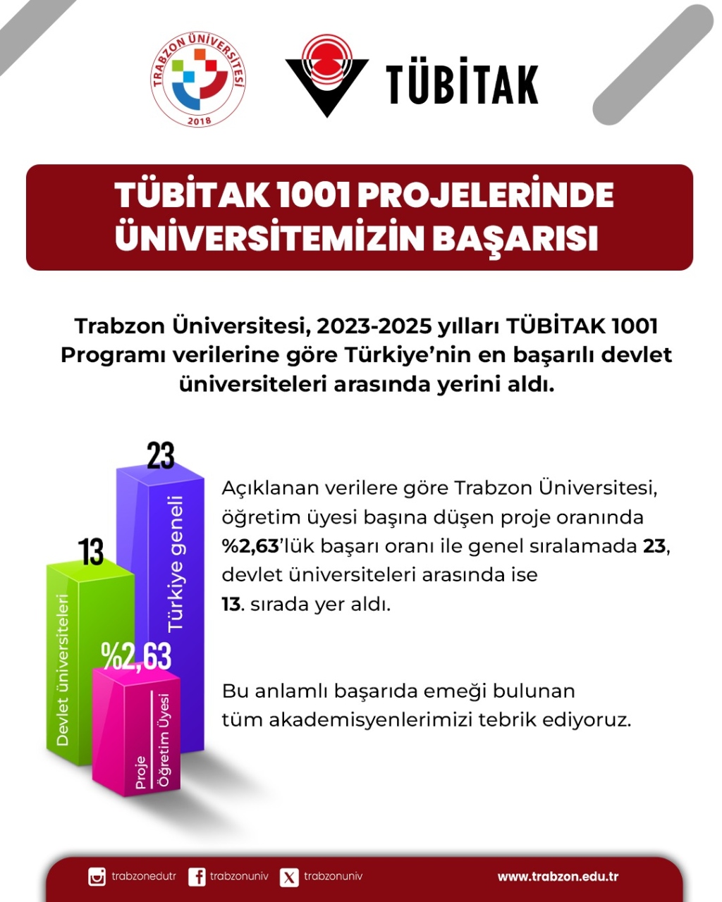 TÜBİTAK 1001 programı kapsamında 2023-2025 yılları arasında destek alan projeleriyle Üniversitemiz, disiplinlerarası araştırmaları teşvik eden yaklaşımı, proje üretim süreçlerine sağladığı kurumsal destek ve akademik kadroların artan araştırma performansıyla dikkat çekiyor. 2023–2025 TÜBİTAK 1001 Programı verilerine göre; Trabzon Üniversitesi öğretim üyesi başına düşen proje oranında yüzde 2,63’lük başarıyla Türkiye genelinde 23; devlet üniversiteleri arasında ise 13. sırada yer aldı.